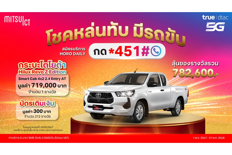 พิเศษสำหรับลูกค้าทรูมูฟ เอช และดีแทค เพียงสมัครบริการ HORO DAILY ดวงรายวัน วันละ 2 ข้อความ ข้อความละ 5 บาท กับ แคมเปญ “โชคหล่นทับ มีรถขับ” ก็มีสิทธิ์ลุ้นรับรถกระบะโตโยต้า Hilux Revo Z Edition รุ่น Smart Cab 4×2 2.4 Entry AT มูลค่า 719,000 บาท จำนวน 1 รางวัล และบัตรเติมเงินทรูมูฟ เอช และดีแทค มูลค่า 300 บาท จำนวน 212 รางวัล มูลค่า 63,600 บาท มูลค่ารวมทั้งสิ้น 782,600 บาท