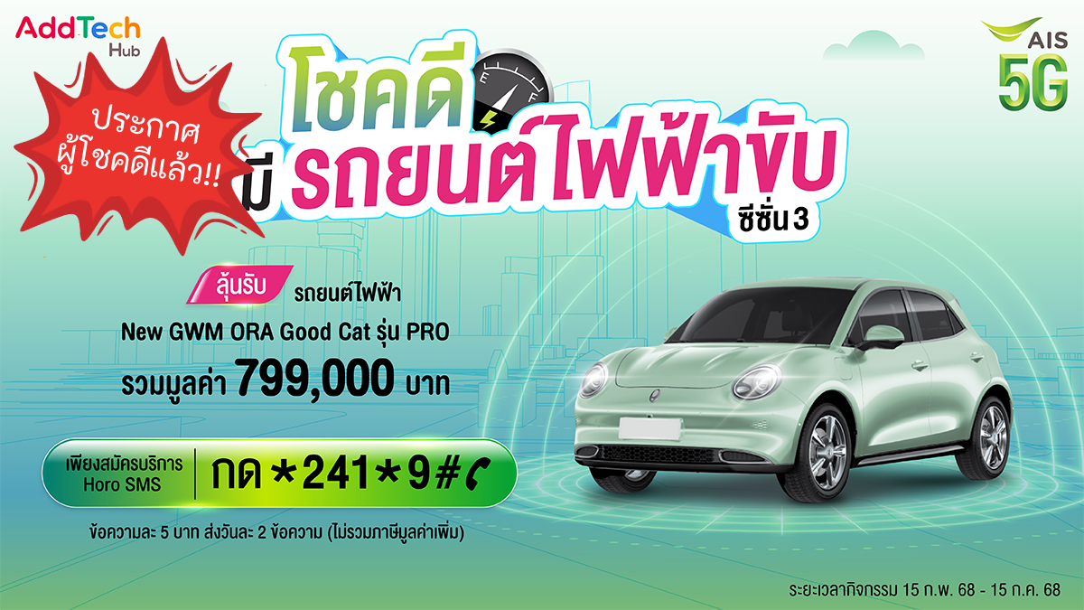 ประกาศผู้โชคดี ที่ได้รับ รถยนต์ไฟฟ้า New GWM ORA Good Cat รุ่น PRO จำนวน 1 คัน มูลค่า 799,000 บาท จากกิจกรรม โชคดีมีรถยนต์ไฟฟ้าขับ ซีซั่น 3 กับ AIS และ AddTech Hub